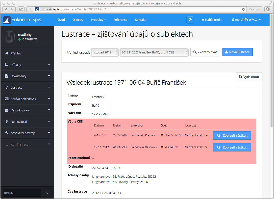 3. Po zadání osoby nebo osob k lustraci je z Vašeho účtu stržena částka za dotaz. Dle exekučního řádu je zpoplatněna i informace, že osoba nemá vedenou žádnou pravomocnou exekuci.